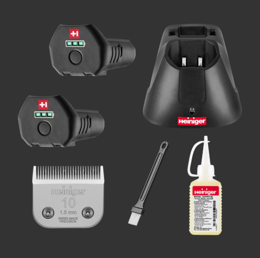 Incluye: 2 Baterías intercambiables, cuchilla Heiniger #10 original incluida, estación de carga, cargador, aceite lubricante y cepillo de limpieza.